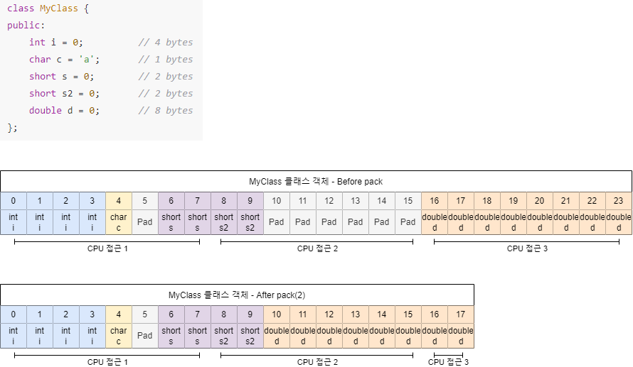 C++에는 구조체나 클래스의 멤버 변수의 크기를 정렬할 수 있는 pack이라는 전처리기 명령어가 존재한다.